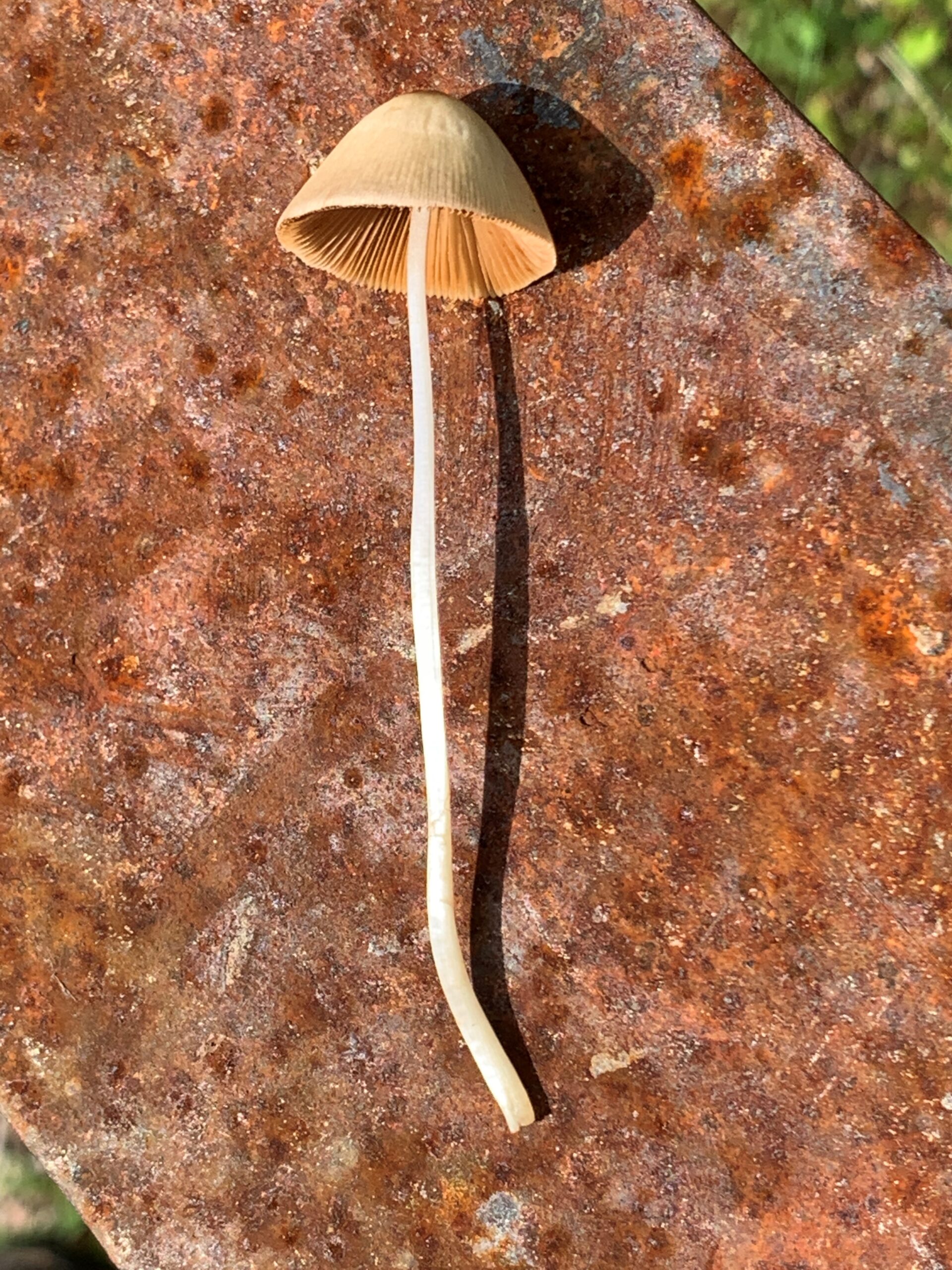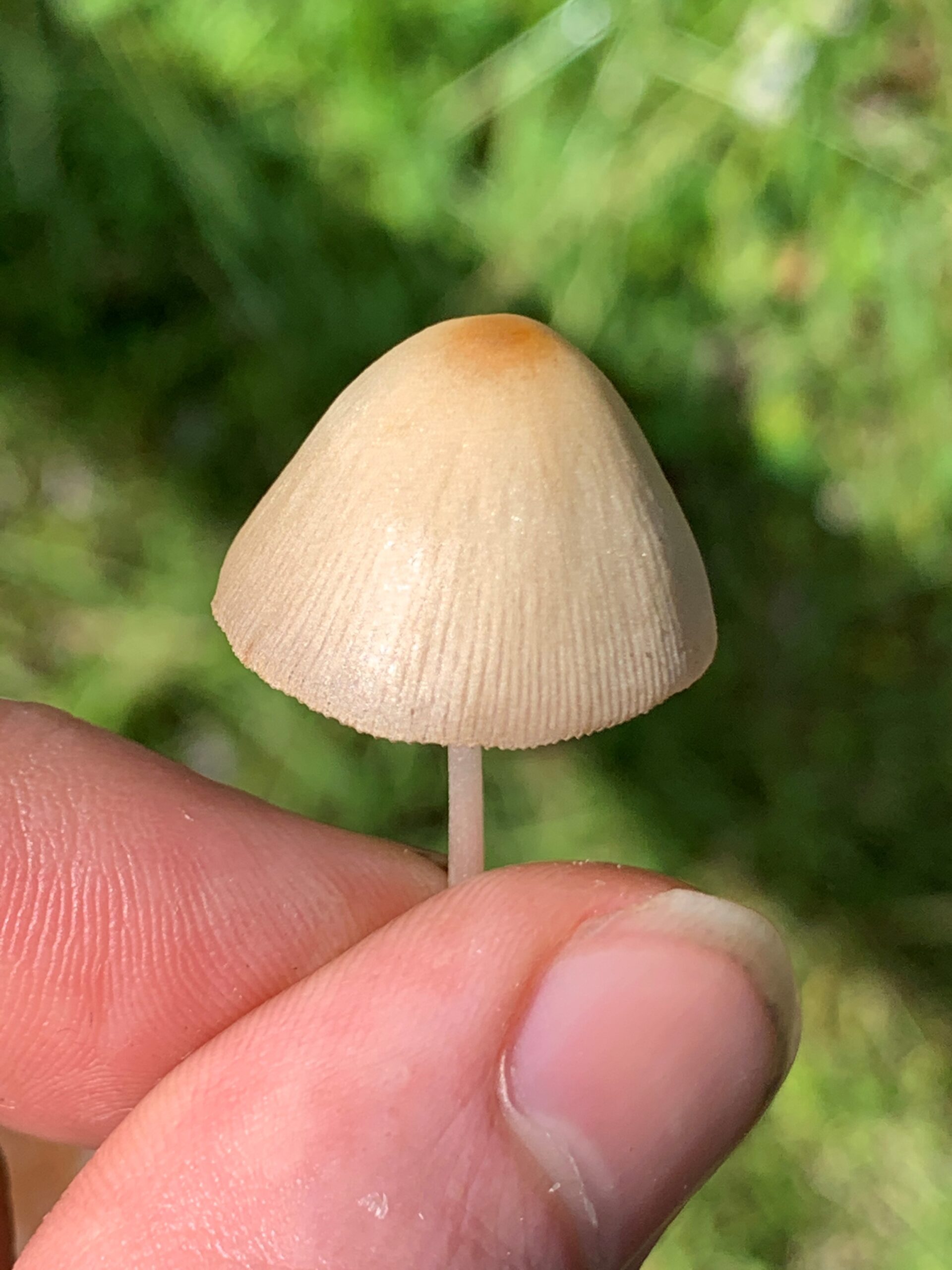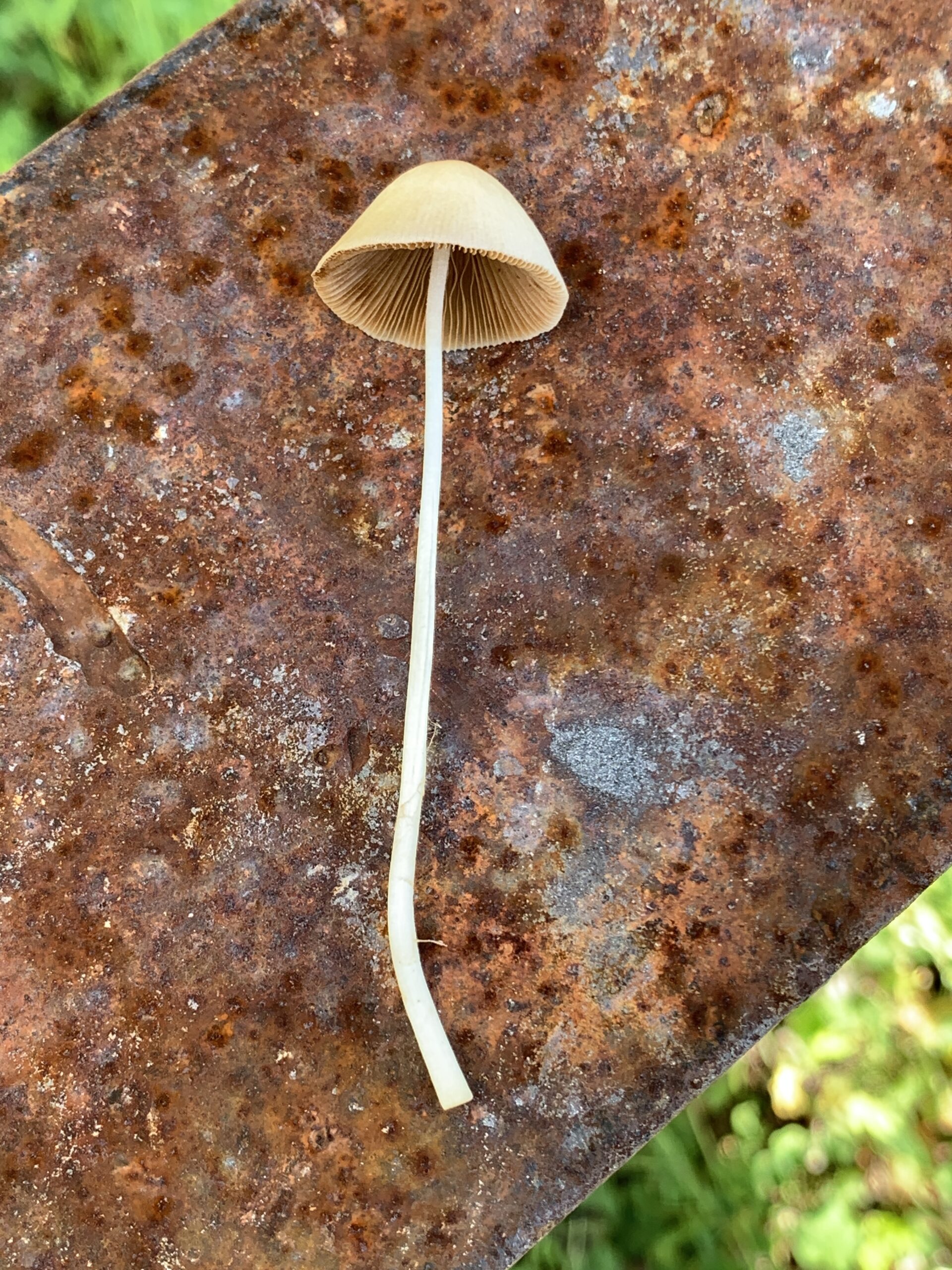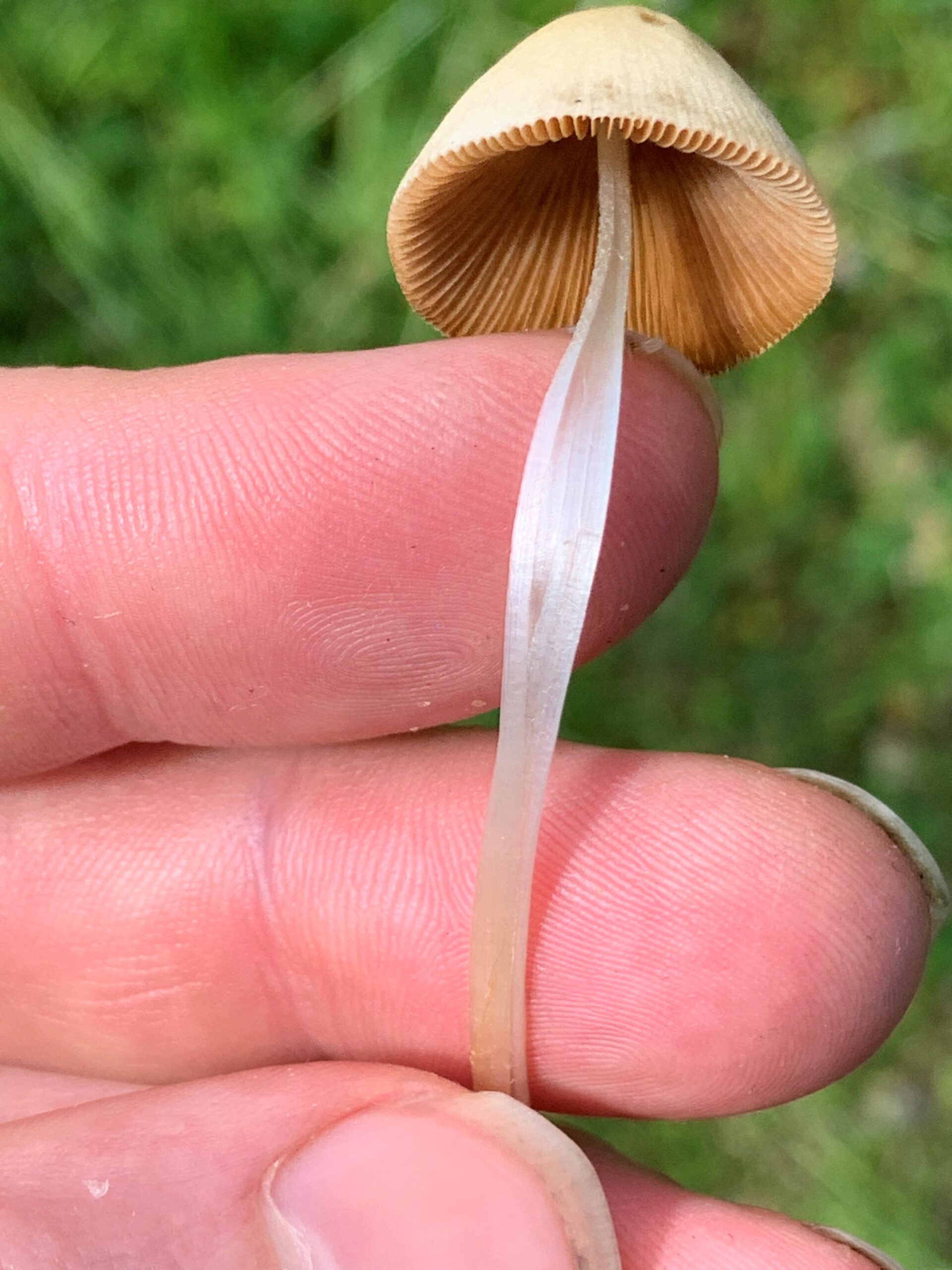 The Conocybe apala has a very thin cone shaped cap, with very thin stem. It’s a very brittle mushroom. It’s very easy to break one of these when picking it. The cap is white to tan, or light brown. The stem is white, bruising brownish when handled. The spore print is purple brown. The cap is very conical in shape for the entire life of the mushroom. Once you get used to the shape, these are very easy to spot. It seems almost impossible for the extremely thin stem to hold up the larger cone shaped cap.