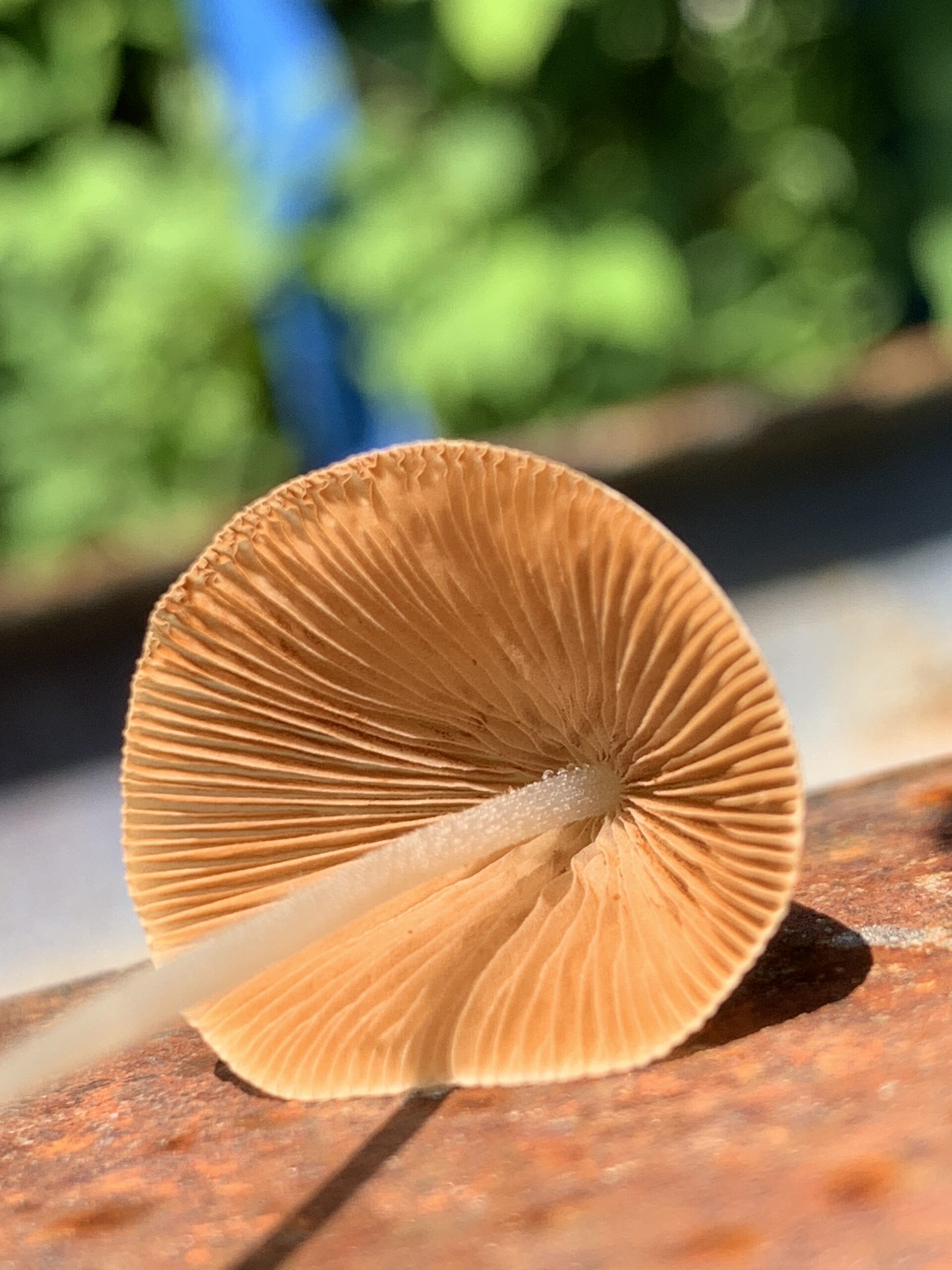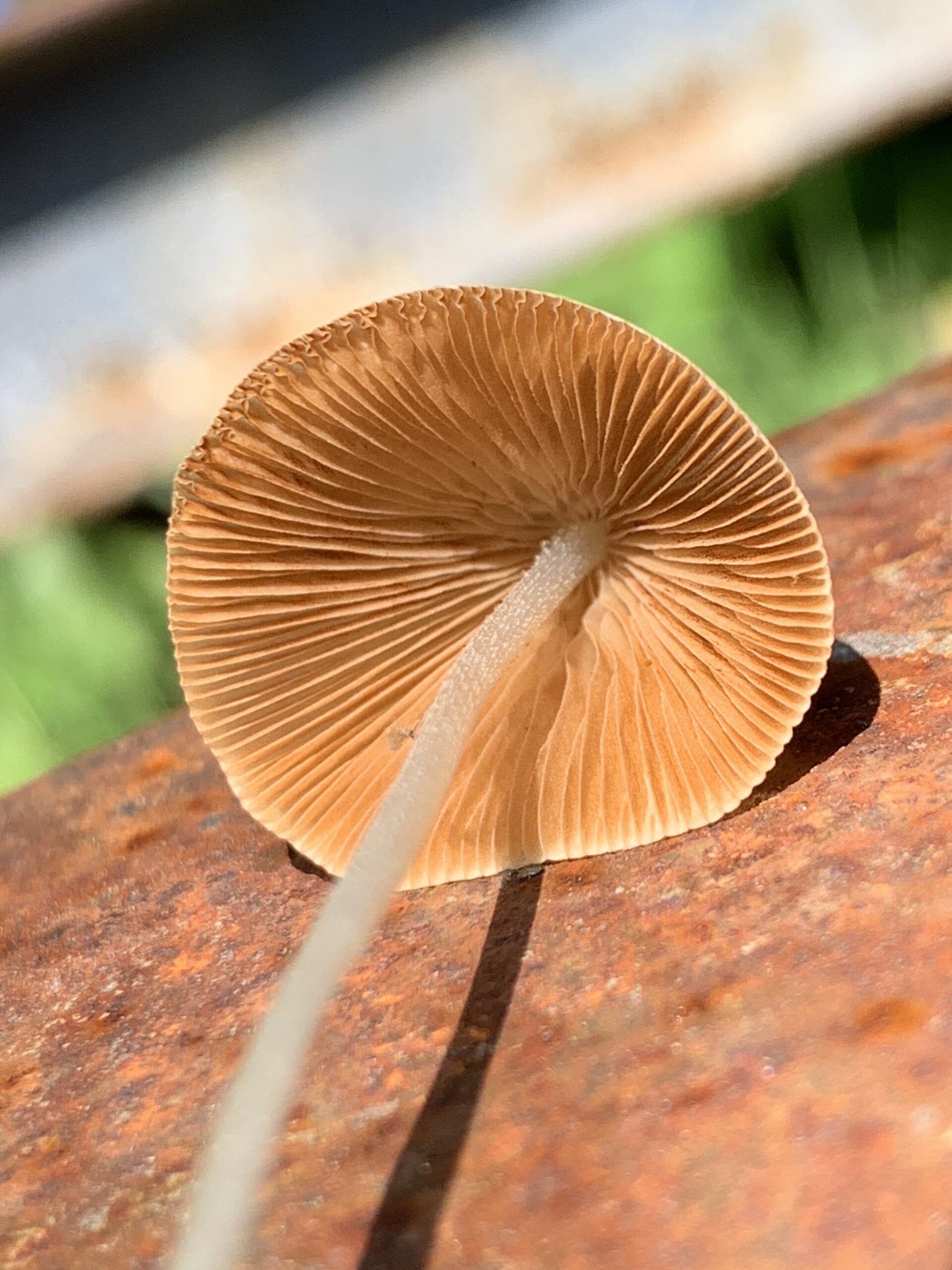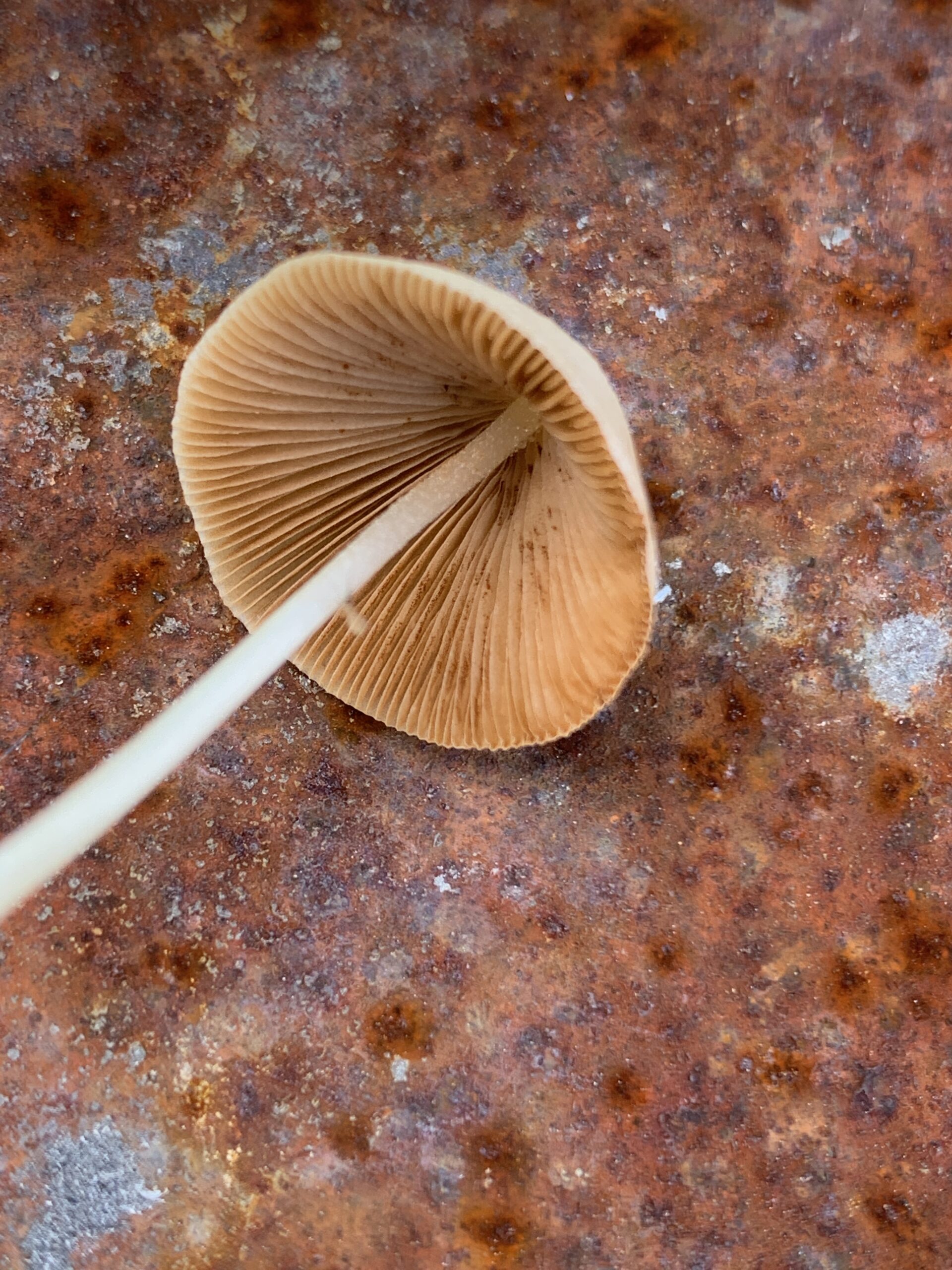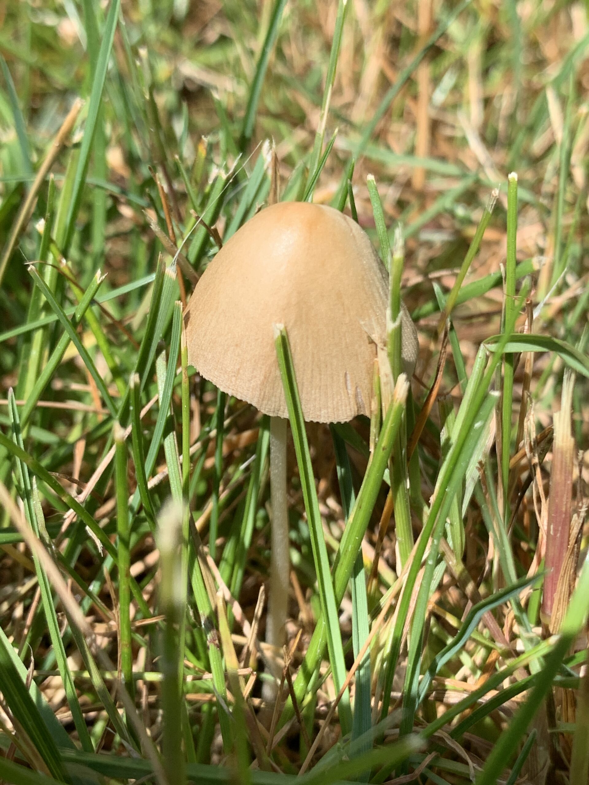 The Conocybe apala has a very thin cone shaped cap, with very thin stem. It’s a very brittle mushroom. It’s very easy to break one of these when picking it. The cap is white to tan, or light brown. The stem is white, bruising brownish when handled. The spore print is purple brown. The cap is very conical in shape for the entire life of the mushroom. Once you get used to the shape, these are very easy to spot. It seems almost impossible for the extremely thin stem to hold up the larger cone shaped cap.